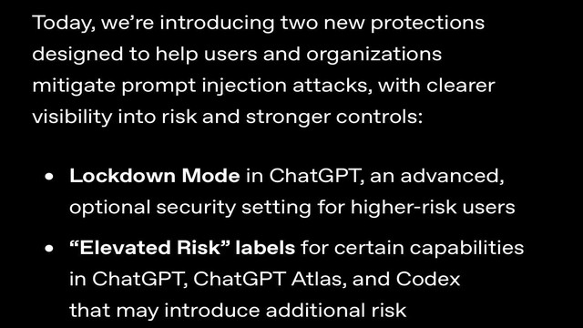 OpenAI has announced two new protective measures: ChatGPT Lockdown Mode and Elevated Risk Labels, designed to help users and organizations mitigate the risks of prompt injection attacks, providing clearer risk visibility and stronger control capabilities.